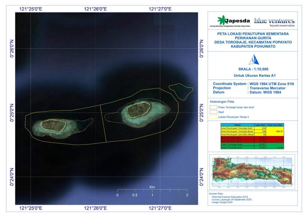 Fasilitator Japesda Desa Torosiaje, Ummul Uffia menerangkan, sebelum dilakukan penutupan area tangkap sementara, pihaknya lebih dulu menggelar musyawarah bersama nelayan gurita pada Senin (8/9/2025). Pada kesempatan itu, dimufakati ada tiga lokasi perairan yang akan ditutup. Masing-masing diantaranya Pulau Besar, Pulau Torosiaje Kecil, dan Lana Besar batuna atau Reef Batu Besar.