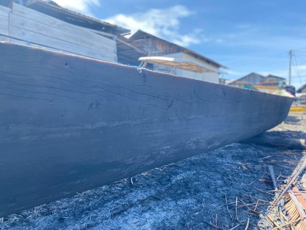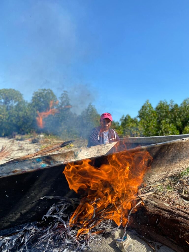 Daun kelapa yang telah dikumpulkan lalu diikat dan dibakar. Satu pelepah daun kelapa memungkinkan satu ujungnya dibakar sementara ujung lainnya dipegang. Ujung yang terbakar itu kemudian didekatkan ke seluruh permukaan badan perahu. Tidak ada ukuran baku untuk tingkat pembakarannya. Hanya ada satu patokan: “Dibakar sampai semua bagian menghitam,” kata Halima.