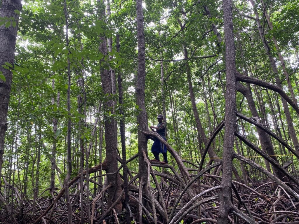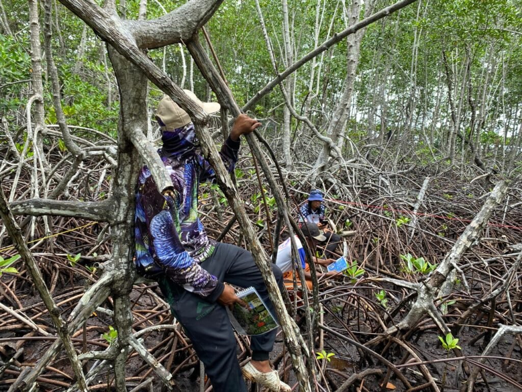 UWEDIKAN – Nasrun Abdullah (40) berjalan di atas akar mangrove dengan penuh waspada, matanya jeli mengawasi sekitar. Jalannya pelan dan terukur, sementara itu, tangan kirinya meraih akar pohon mangrove yang timbul ke permukaan tanah, tangan kanannya memegang clipboard yang dijepit kertas putih, dengan pensil yang terselip di antara papan.